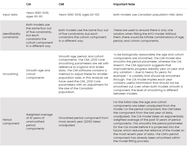 Ambos modelos utilizan el modelo APCI para ajustarse a un rango de edades. El CIA ajusta de 40 a 90 años y el CMI de 20 a 100 años. Para extender el modelo a edades más avanzadas, se necesita una extrapolación.