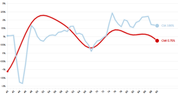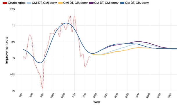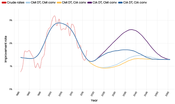 Las mejoras por edad son más uniformes en el modelo CMI que en la escala del CIA, lo cual puede parecer más intuitivo al proyectar esta tasa hacia el futuro. Por otro lado, es probable que el modelo del CIA refleje más de cerca la experiencia reciente, y podríamos esperar que las tasas de mortalidad sean uniformes en la proyección futura, no necesariamente las tasas de mejora.