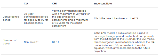 El CIA estableció una LTR proyectando su modelo estocástico hacia adelante mediante una serie temporal y estimando la LTR independiente de la edad que más se acercaba a su pronóstico estocástico central (sección 6 del documento del CIA). Este es un método muy basado en datos. El CMI, en cambio, opta por no establecer una LTR.