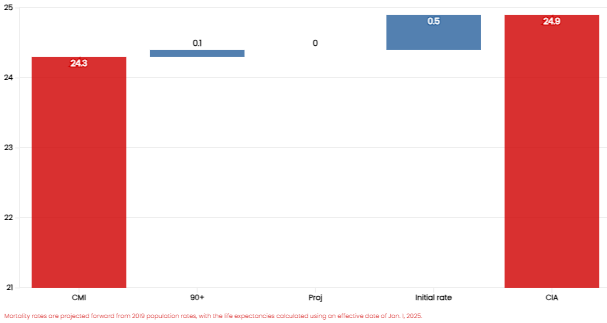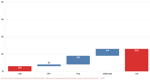 Los gráficos de cascada muestran cómo varía la esperanza de vida de una persona de 65 años al pasar del modelo CMI al modelo CIA. Los componentes del modelo APCI están interconectados, y el impacto asociado a cada paso variaría si estos se aplicaran en un orden diferente. Sin embargo, los gráficos de cascada siguen siendo útiles para mostrar cómo los distintos componentes impulsan la diferencia entre los modelos del CIA y del CMI.
