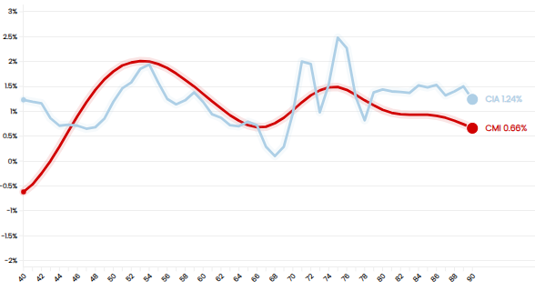 La tasa inicial del CIA es más alta en edades avanzadas que la del CMI. Esto contribuye a que las expectativas de vida proyectadas con la tasa inicial del CIA sean mayores.