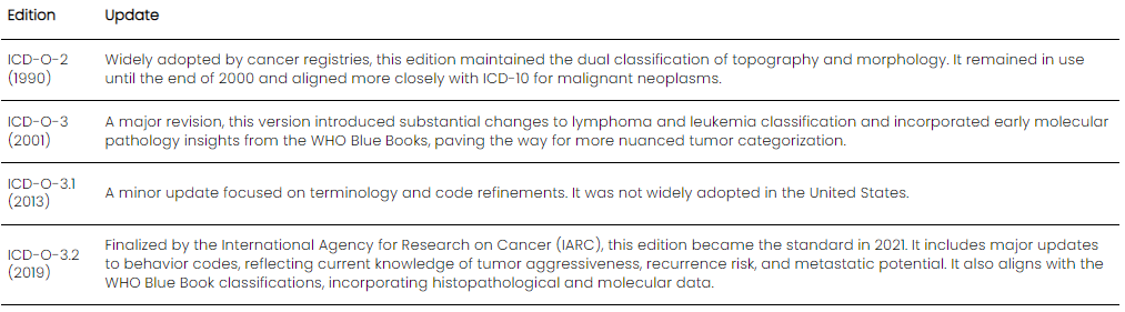 La Clasificación Internacional de Enfermedades para Oncología (ICD-O) fue introducida por la Organización Mundial de la Salud (OMS) en 1976 como un sistema especializado para codificar los registros oncológicos. A diferencia del sistema ICD general, que clasifica las enfermedades en sentido amplio, el ICD-O recoge las características específicas de los tumores, incluidas su topografía (sitio anatómico), morfología (tipo celular), comportamiento y grado.