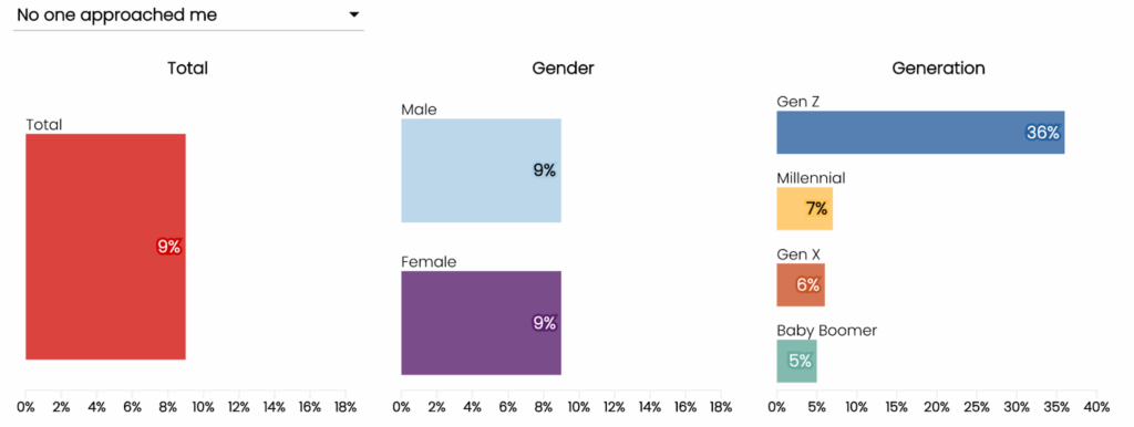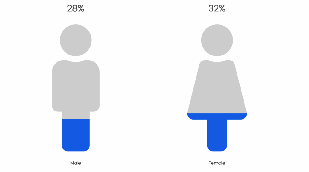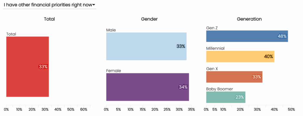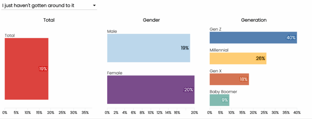 - Esta brecha no se distribuye de manera uniforme y se reporta más alta en ciertos segmentos demográficos, incluidos las mujeres, las personas con ingresos más bajos y las generaciones más jóvenes (véase la Figura 1).²