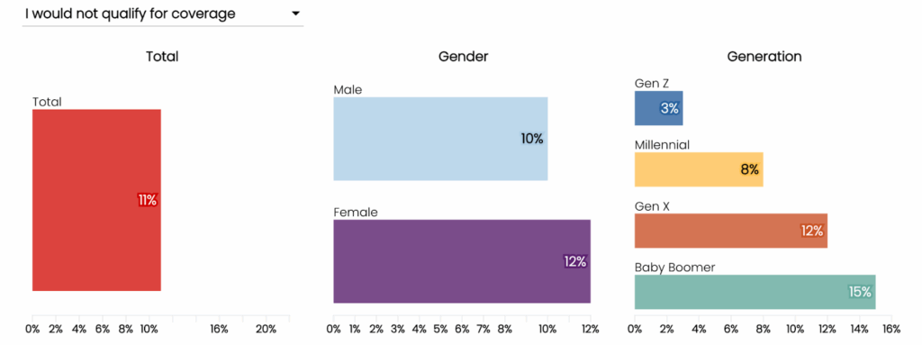 - «No calificaría». De nuevo, en parte puede explicarse por ideas equivocadas de ciertos clientes sobre su elegibilidad, pero probablemente también refleja retos reales para segmentos de mayor riesgo de la población, como personas mayores o personas con problemas de salud actuales o pasados.